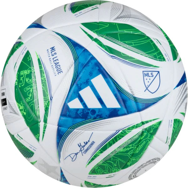 This durable ball is perfect for both training and matches. Featuring the vibrant colors of the '96 MLS logo, it is primarily white with accents of green and blue—the same colors used for the 25th-anniversary ball in 2020.